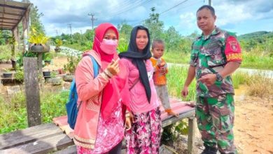 JEJAKKHATULISTIWA.CO.ID, Kutai Timur – Koramil 0909-01 Sangatta, Babinsa Teluk Lingga Kopti Yoyok bersama bidan langsung mendatangi dari rumah ke rumah…